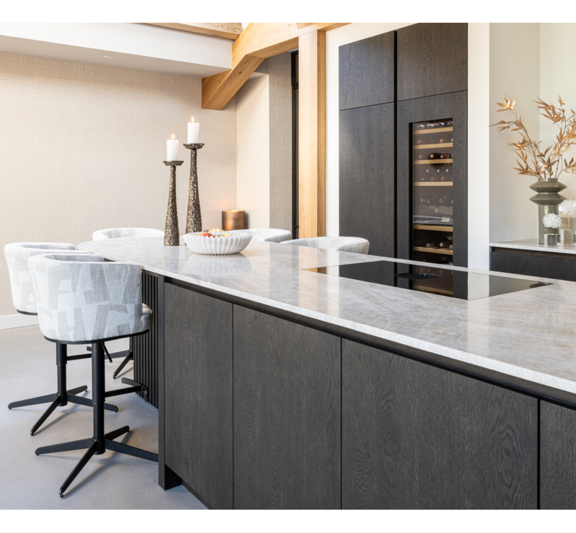 Élégant tabouret de bar en velours kaki avec pieds dorés.