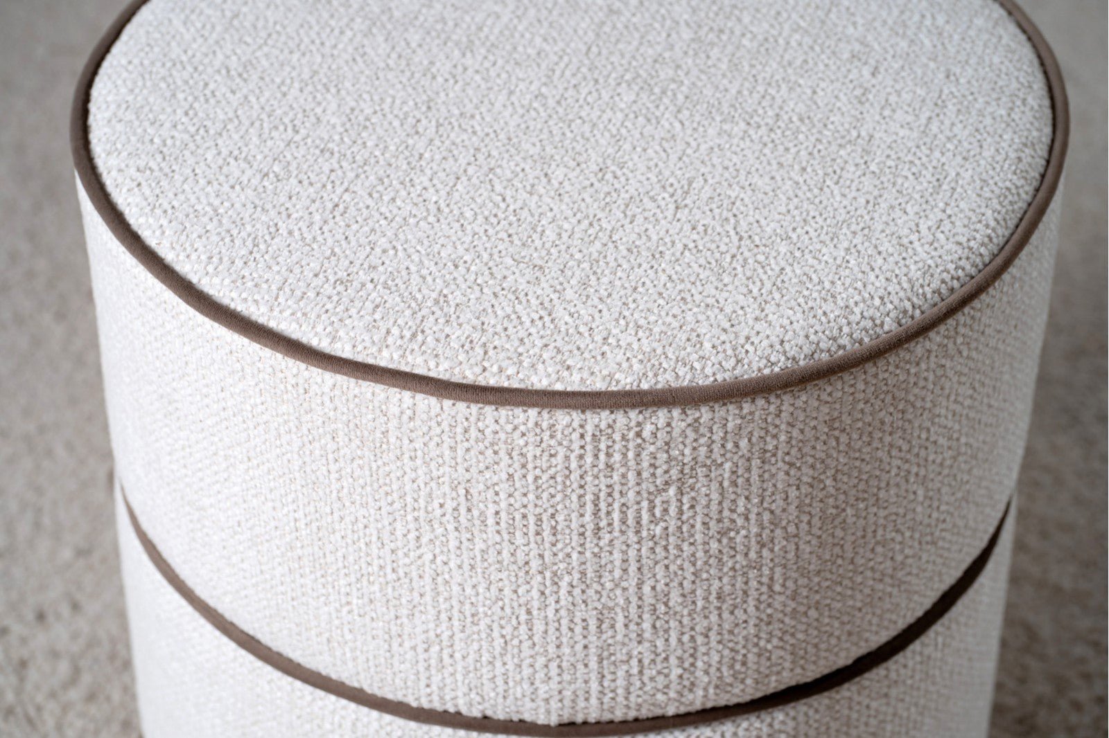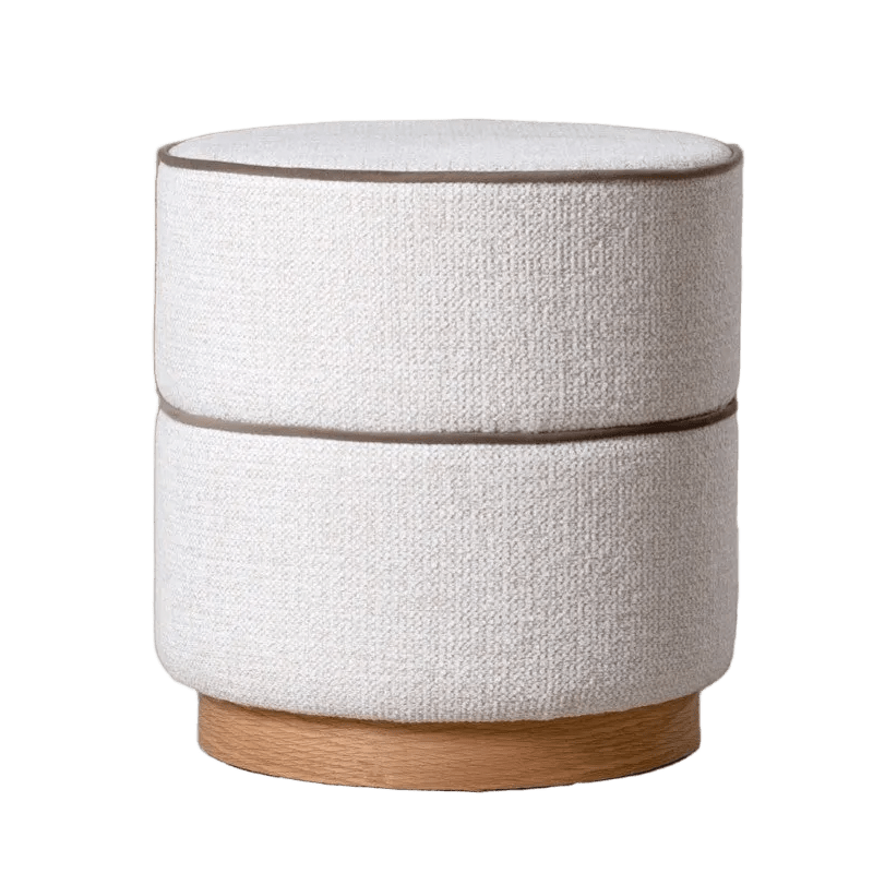The Ada Pouf comprises two cylindrical poufs upholstered in textured ivory fabric, each finished with a contrasting dark taupe velvet trim that runs along the perimeter and across the top and center of the piece. The natural ash wood base provides understated elegance and stability. These poufs pair seamlessly with the larger round Ada pouf from the collection, creating a cohesive seating arrangement that brings calm and sophistication to any interior. Ideal for flexible seating, footrests, or accent pieces in contemporary and transitional spaces.