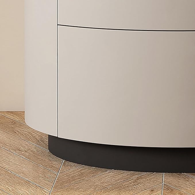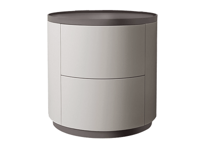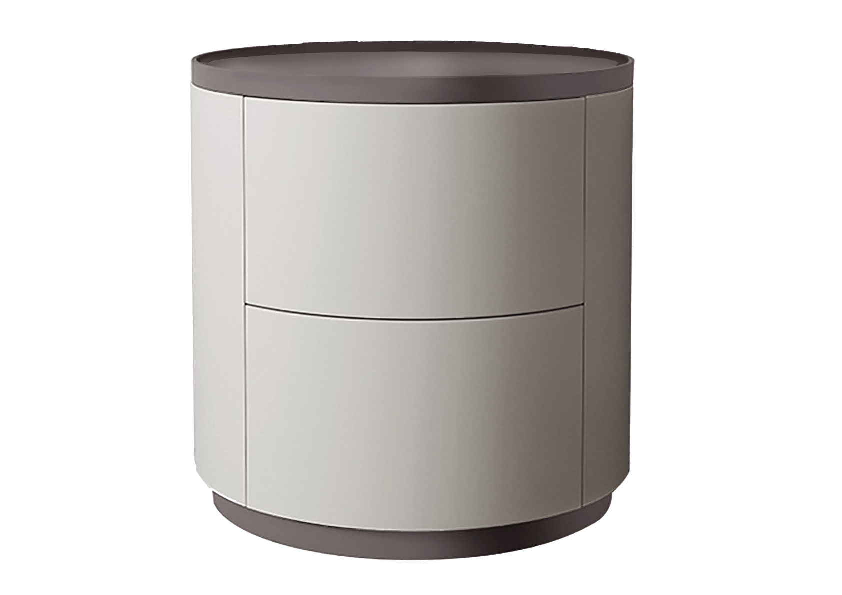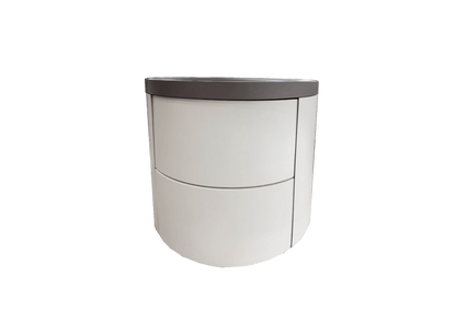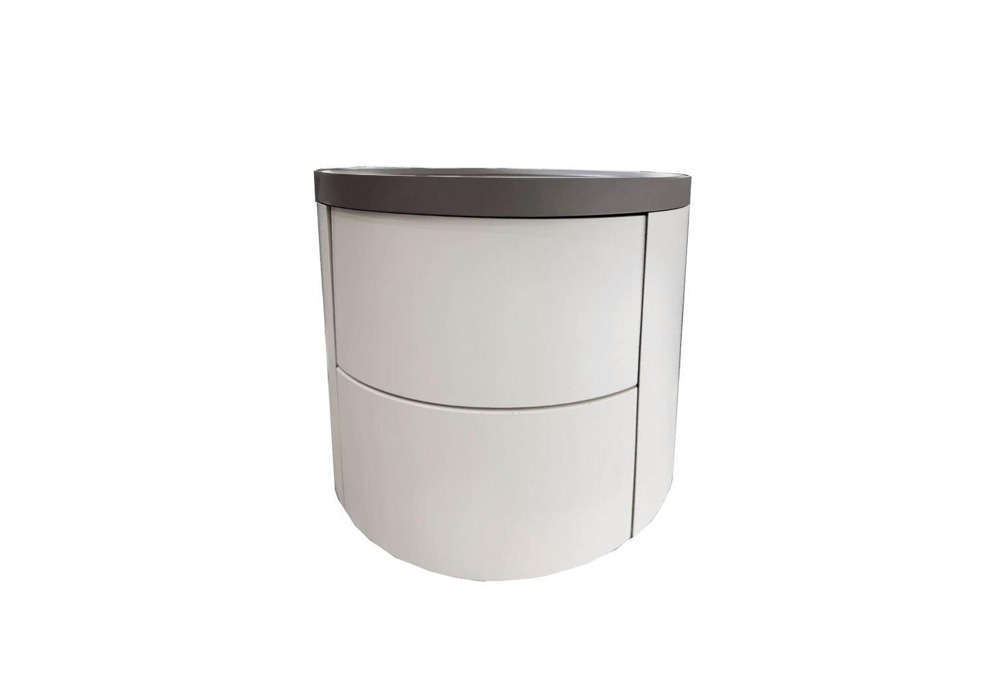Elegant circular bedside table with two drawers. Lacquered MDF and wood. Available in beige with grey top.