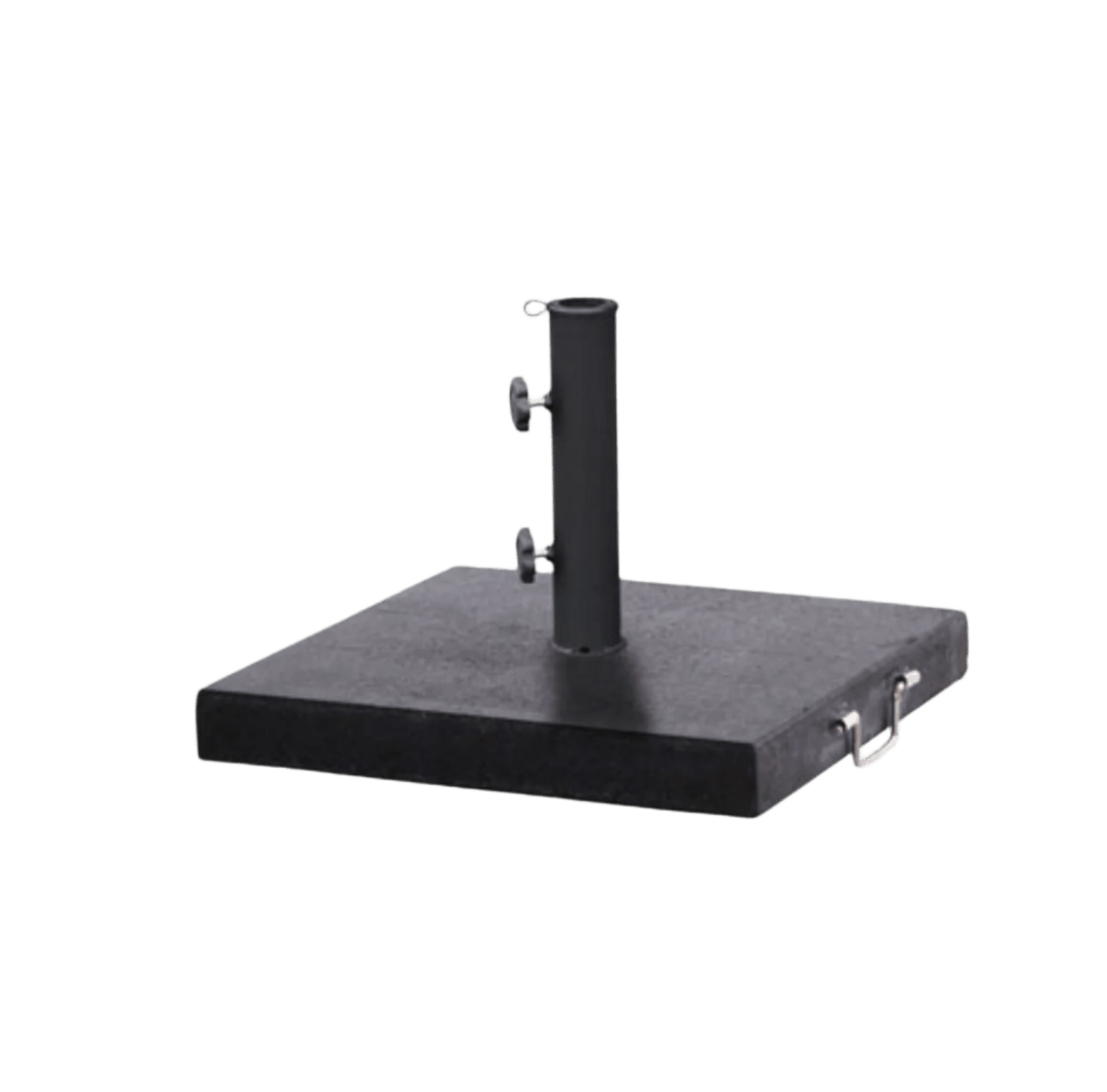 Black parasol base 40kg. Our stylish and high-quality parasols deserve just as good a parasol base. We don’t just recommend a granite parasol base just for its looks, but also for use with a parasol with a large cloth surface which needs a heavy base to stand solid. It is a beautiful natural stone and heavy in terms of specific weight.