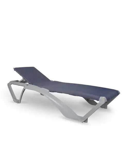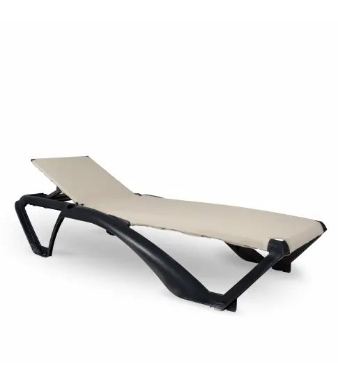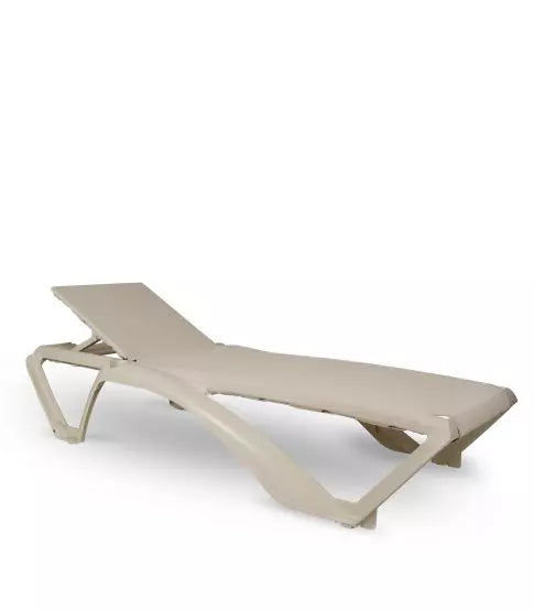 Stackable sunlounger. Polypropylene and fiberglass White frame. Textilene 1170 gr/ m2, thermal bonding, to improve resistance, double linen weft and warp. UV protection. Wheels under back legs and non-slip end-plates under front and back legs. Glass holder. Net weight: 10.65 kg.Four-position reclining sunlounger.